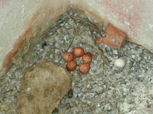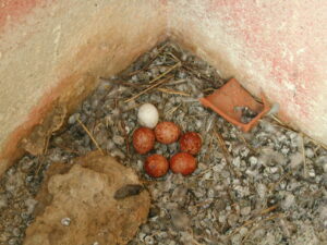 Bílá, tedy zcela bílá, vejce zřejmě nemají v poštolčím světě moc velkou šanci na to, aby byla vysezena. I u nás jsme v prvním roce, kdy u nás poštolky hnízdily, objevily vedle pěti zrzavých vajec jedno čistě bílé, o kterém jsme se zřejmě mylně domnívali, že je holubí. Budeme muset zřejmě přehodnotit historické statistické údaje… „Naše“ poštolky na bílém vejci zřejmě občas i seděly, střídavě jsme ho totiž nacházali pohromadě s ostatními a odkutálené mimo ně.