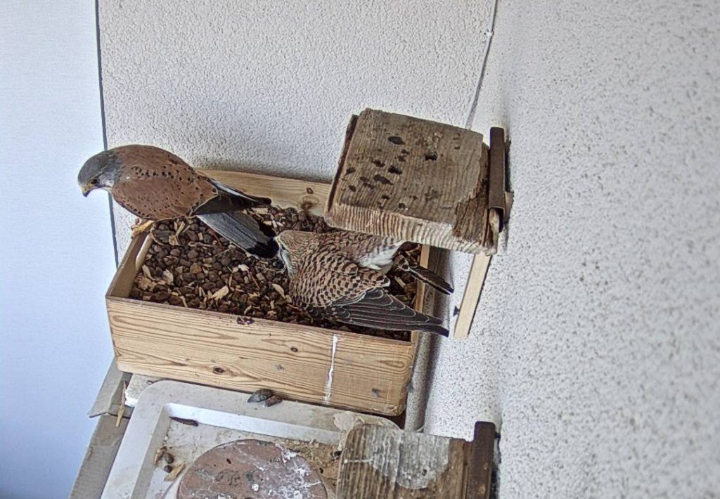 Sameček se raději odklidil na bidýlko nad starým hnízdem na protilehlé straně lodžie a nějakou dobu úspěšně předstíral, že nic neslyší. Samička přitom konzumovala myše a nepřestávala kvílet, takže nakonec se rozhodl jí vyhovět a to hned několikrát po sobě: