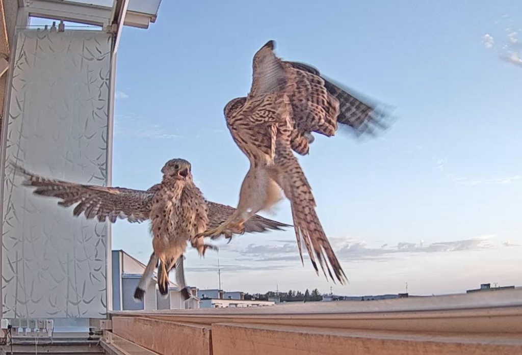 Ranní a večerní rozmíšky s poštolčaty, co si adoptovala „našeho“ samečka jsou u nás opravdu na denním pořádku. Samička, která v lodžii pravidelně přespává, se do toho moc neplete. Je to jen mezi poštolčaty a samečkem, který samičku každé ráno a večer navštěvuje. Dnes ovšem už i lítalo peří…