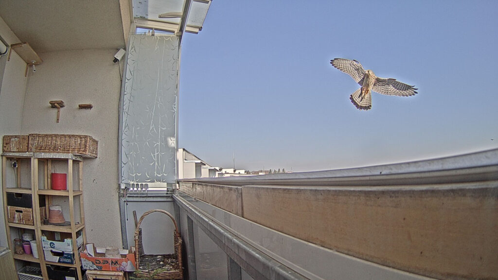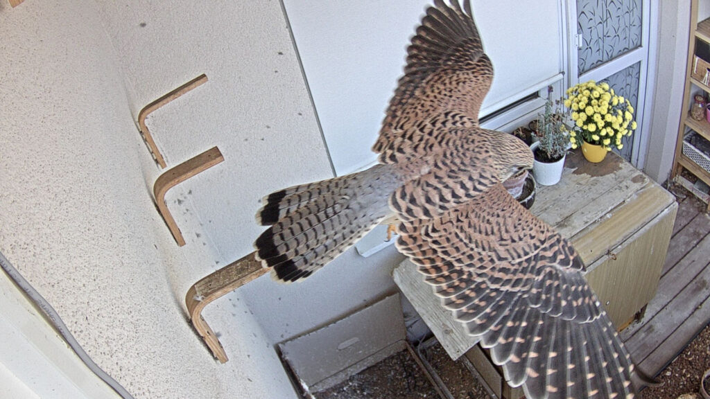 „Naše“ paní poštolka si nebývalé aktivity domácích lidí v lodžii povšimla a začala poletovat kolem a hlasitě křičet. Jen, co se za námi zavřely dveře, přistála ještě celá rozčilená na bidýlku.