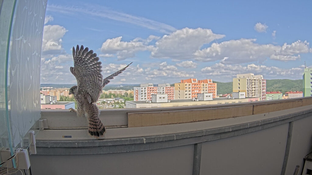 Zřejmě pod dojmem leteckých úspěchů sourozenců a také proto, aby nebyl sám, se nakonec i benjamínek odhodlal opustit koš. Ne, že by se vydal rovnou ven, v 9:51 přistál na zábradlí.
