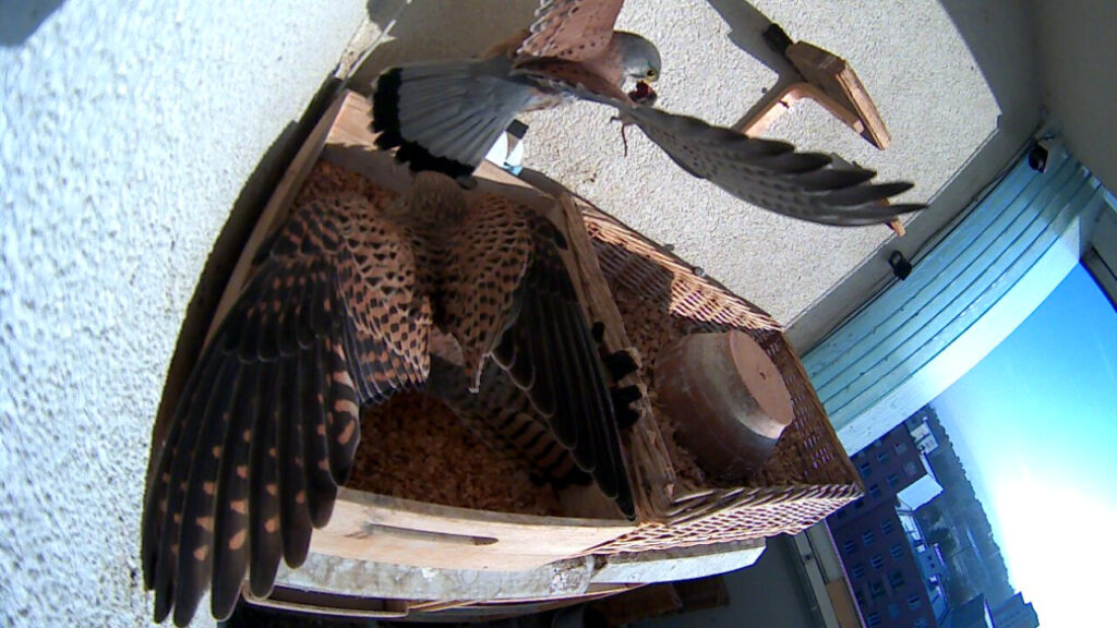 V pondělí ráno si samička jednoho hraboše přinesla domů na bidýlko nad starým hnízdem. Sameček jí ho nejspíše předal někde venku v ulici nebo si ho vyzvedla ve spižní skrýši.