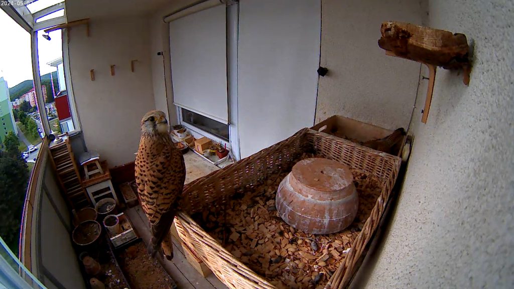 Dnes po ránu (přibližně v 8:40) se v naší lodžii opět objevila mladistvá cizí poštolka. Možná je to ta neokroužkovaná ze včerejška. Vypadá spíše jako mladý nepřepeřený sameček.