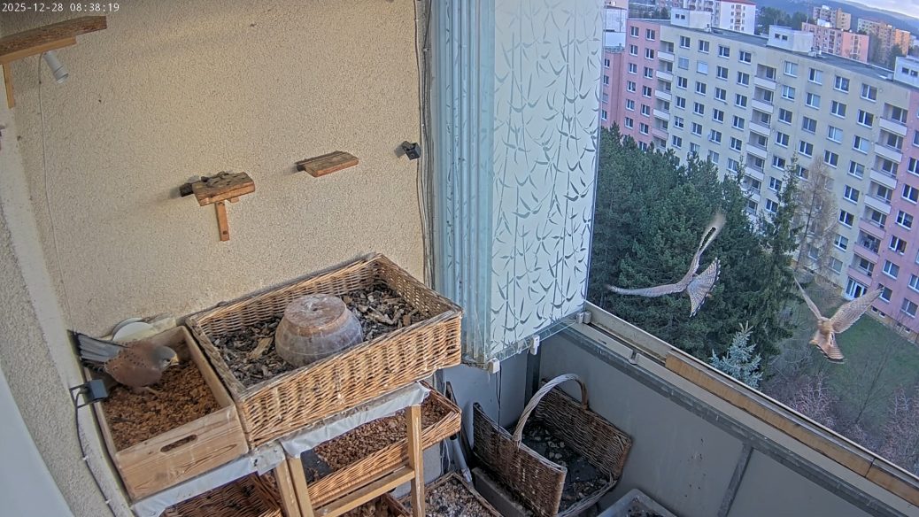Dnes se v poštolčí lodžii opět objevila cizí poštolka s šedým ocáskem. Zřejmě zde tráví zimu stejně jako „náš“ domácí pár. Přiřítila se za samečkem a sledovala ho až na hnízdo. Její počínání ovšem neuniklo pozornosti domácí samička přes kterou cizinka raději vyklidila pole. Zůstala však někde opodál a když opět začala obletovat, tak to domácí nevydrželi a vyrazili, aby ji zahnali.