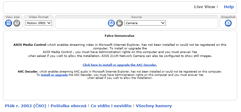 Zavítáte-li na tuto stránku poprvé, tak, pokud nemáte nainstalován AXIS Media Control (AMC), což pokud nesledujete jiné kamery z rodiny AXIS, nebudete mít, uvidíte na obrazovce nejspíše toto:
